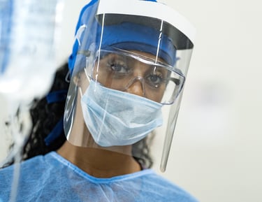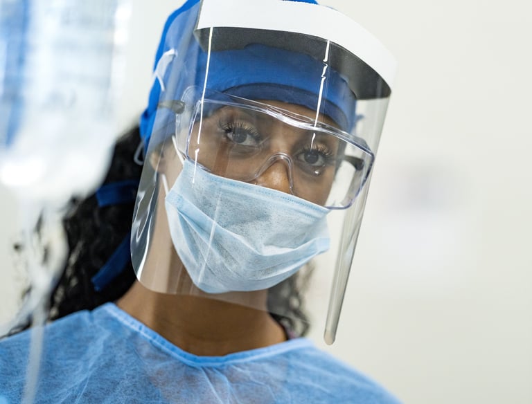 Protective face shields and goggles for safe patient handling and infection control in healthcare environments.